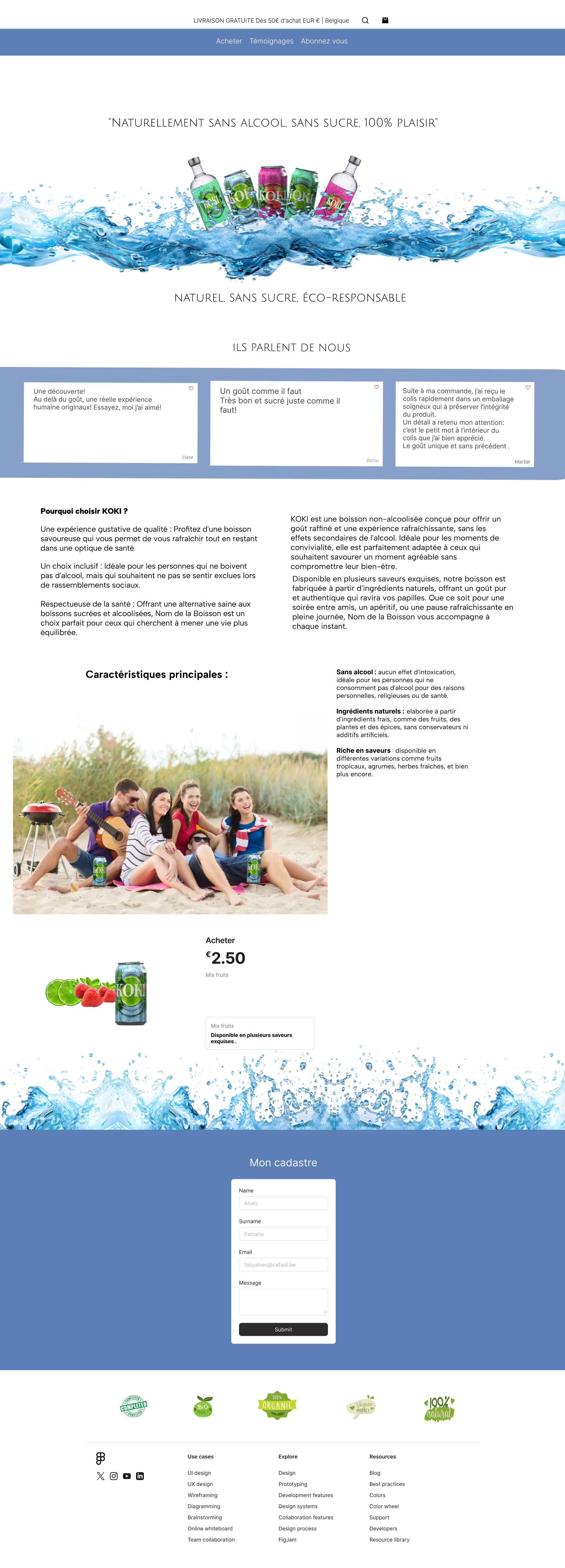 Koki : prototypage d'une page de site web, réalisée avec Illustrator où j'ai réalisé l'étiquette de la boisson, j'ai ensuite utilisée Spline 3D pour étiqueter le cannet, et figma pour structurer la page web.
