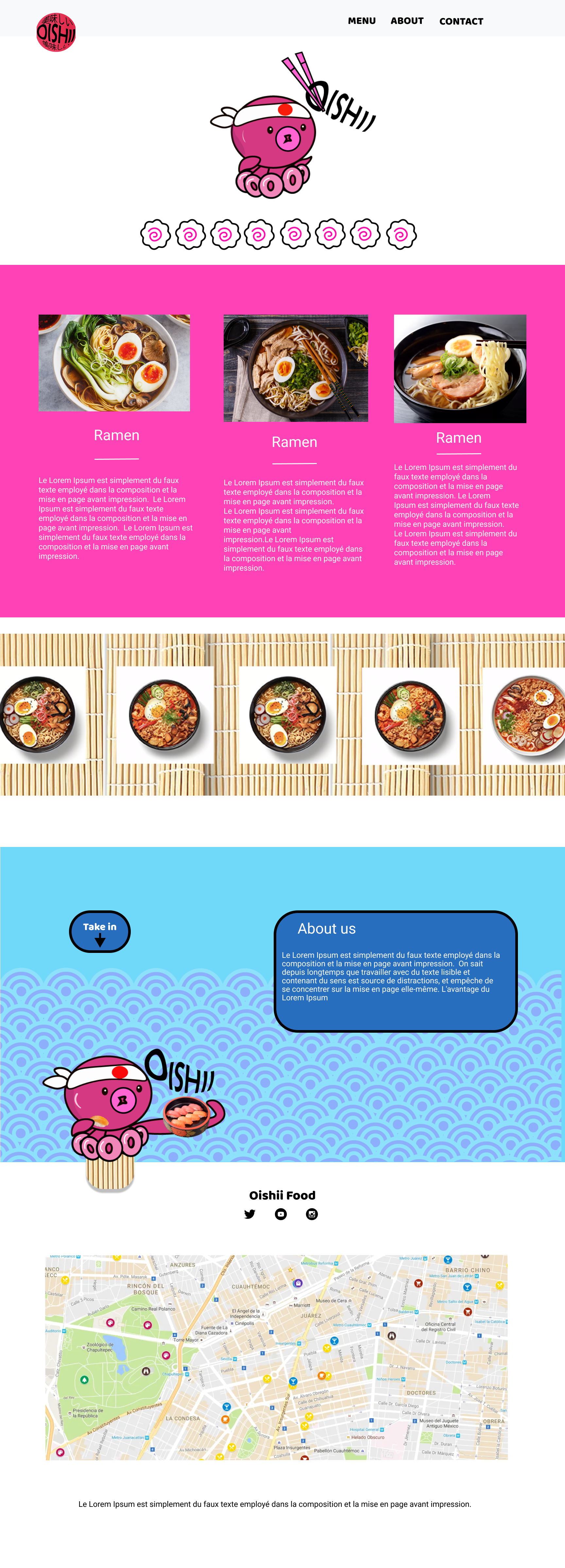 Oishi: Prototype d'un site one page restaurant Japonais sur Figma et retouches Création d'une mascotte qui j'ai desinée sur Illustrateur.
